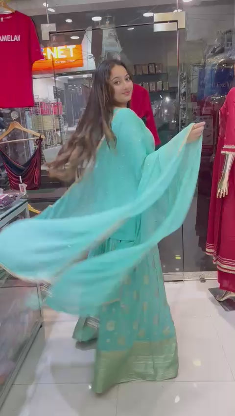 Step into elegance with this stunning aqua sharara set that's pure magic! Crafted from premium chiffon, this ensemble features a vibrant, eye-catching cyan hue that radiates sophistication. The intricate hand-work detailing adds a royal touch, making it perfect for celebrations and special occasions. The luxurious dupatta drapes beautifully, completing your look with grace. Designed for those who appreciate quality and style, this high-class piece promises comfort without compromising on glamour. Turn heads and feel absolutely fabulous!