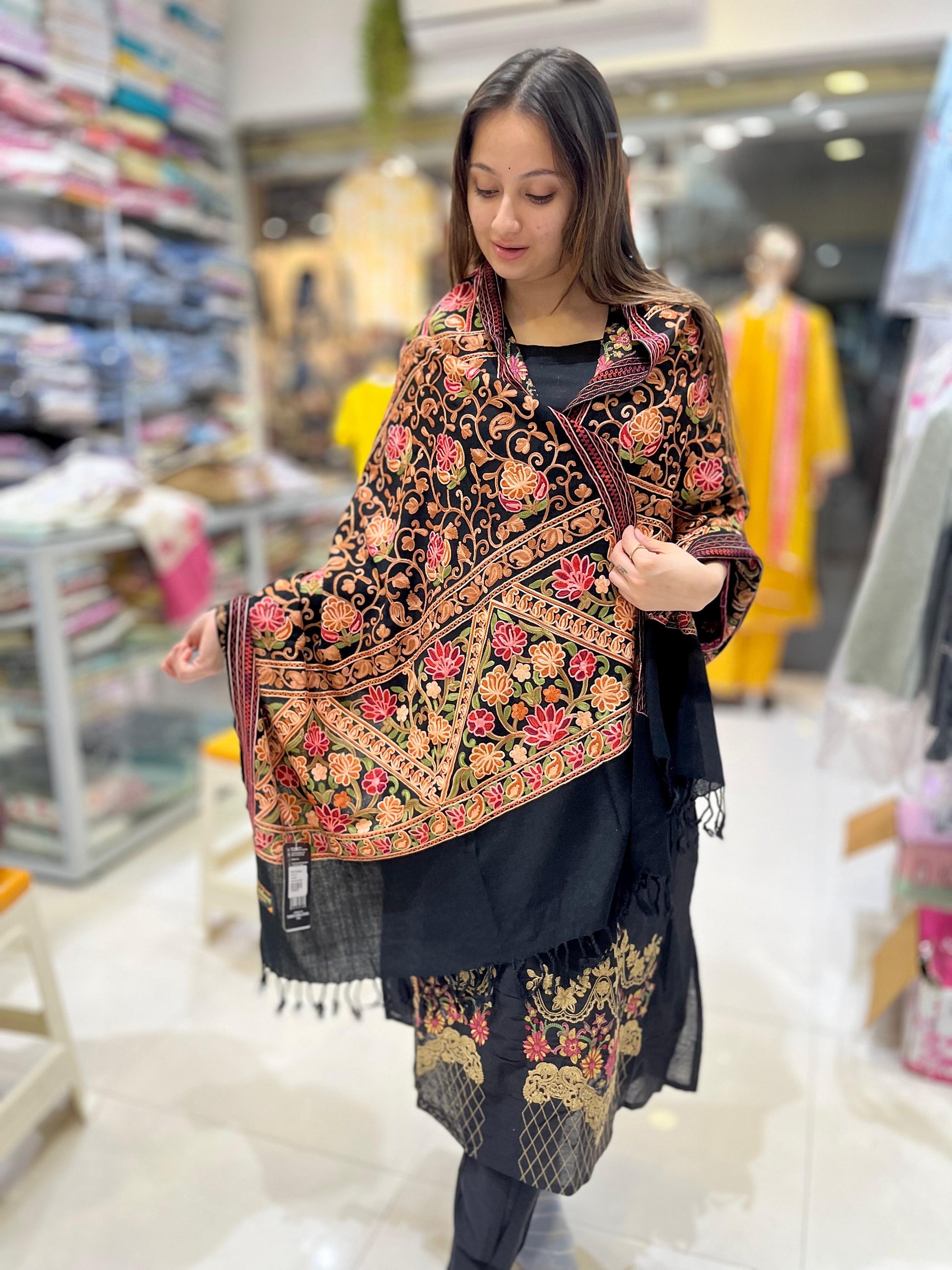 The LUXE BLACK full embroidered shawl exemplifies refined craftsmanship through meticulous hand embroidery executed on premium fabric. Each intricate pattern is carefully rendered to create visual depth and sophistication, making this piece a distinguished addition to any wardrobe. The superior quality construction ensures durability and longevity, while the full embroidered design provides versatile styling options for both formal occasions and elevated everyday wear. This shawl combines traditional artistry with contemporary elegance, offering a timeless accessory that transcends seasonal trends.